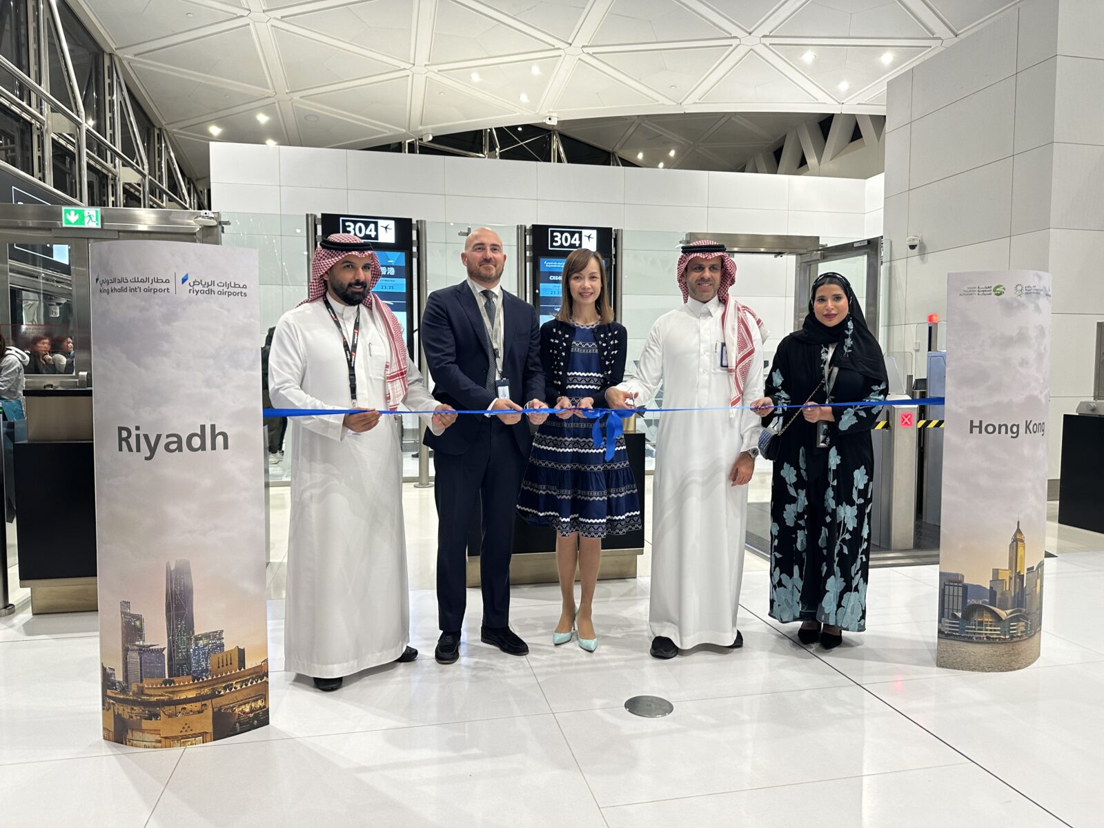 Al llegar al Aeropuerto Internacional Rey Khalid de Riad a bordo del vuelo inaugural, Lavinia Lau de Cathay fue recibida por el director comercial de Riyadh Airports Company, Abdulaziz Al-Asaker, y representantes del Programa de Conectividad Aérea de Arabia Saudita.