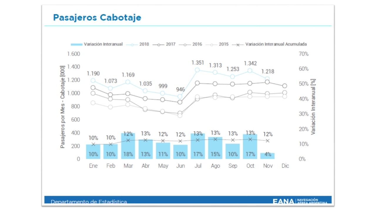 En el mes de noviembre, viajaron 1.218.000 pasajeros en vuelos comerciales de cabotaje, cifra que representa un +4% más respecto del mismo mes del año pasado, cuando volaron 1.169.000, según los datos estadísticos elaborados por el Ministerio de Transporte, a través de la Empresa Argentina de Navegación Aérea (EANA) y a partir del Sistema Integrado de Aviación (SIAC)