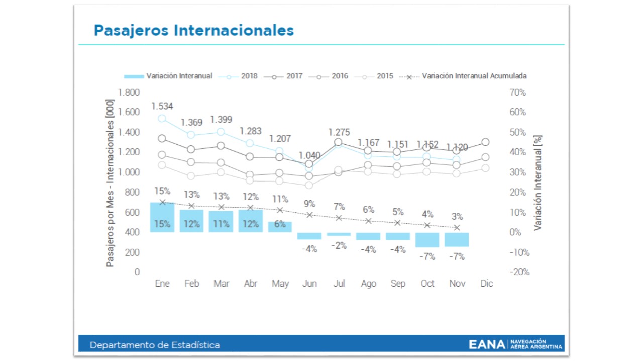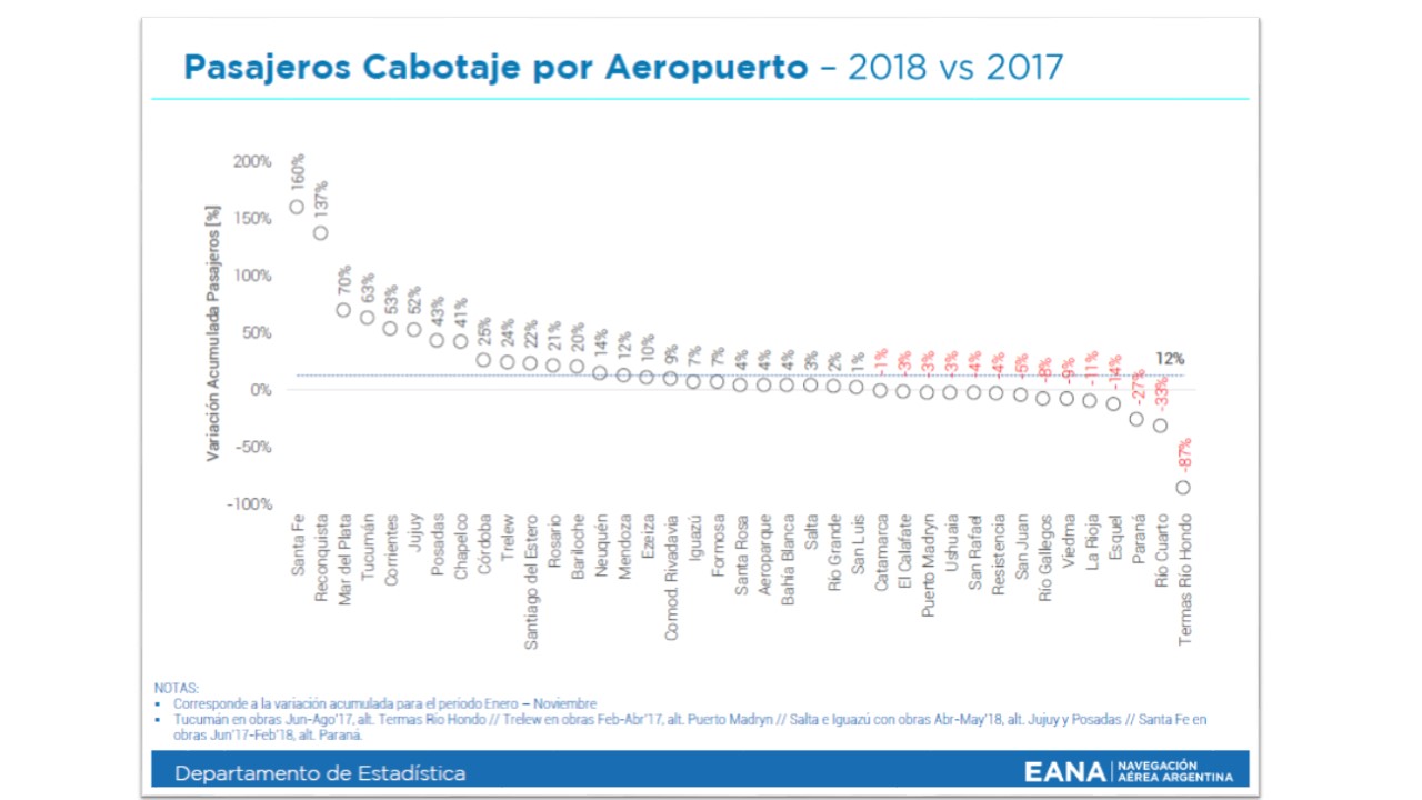 Según informó EANA en su comunicado de prensa, los paros de Aerolíneas Argentinas del 8 y 26 de noviembre explican una caída interanual de 8% en vuelos de cabotaje (representa 72.000 pasajeros menos) mientras que Flybondi, Norwegian Argentina y Avianca crecieron, transportando 153.000 pasajeros en el mismo período.