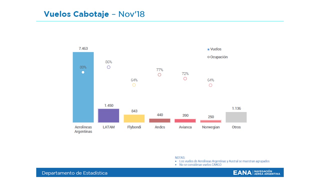 En cuanto al factor de ocupación en los vuelos de cabotaje el Grupo Aerolíneas Argentinas (Austral + Aerolíneas Argentinas) presentó un factor de ocupación del 80% (-3%) la cuota de mercado es del 65% (-9%), LATAM 86% (+1%) cuota de mercado 17% (-3%), Andes 77% (-3%), Flybondi 64% (inicio operaciones este año) cuota de mercado 8%, Avianca 72% (inicio operaciones este año) cuota de mercado 2% y Norwegian 64% (inicio operaciones este año) cuota de mercado 2%.