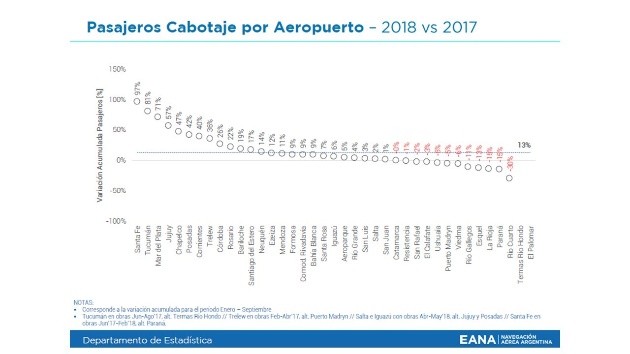 Según los datos estadísticos elaborados por el Ministerio de Transporte, a través de la Empresa Argentina de Navegación Aérea (EANA) y a partir del Sistema Integrado de Aviación (SIAC), durante el mes de septiembre de 2018 viajaron 1.243.000 pasajeros en vuelos comerciales de cabotaje, cifra que representa un +9% respecto del mismo mes del año pasado (1.136.000. pax 2017). En el acumulado anual, el crecimiento alcanza un +13% contra los primeros nueve meses del 2017, con un total de 10,32 millones de pasajeros en comparación contra los 9,16 millones del año pasado.