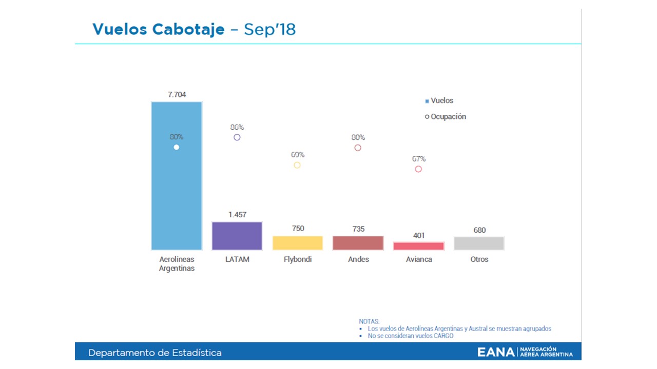 En cuanto al factor de ocupación de las líneas aéreas en el mercado de cabotaje el grupo Aerolíneas Argentinas (Aerolíneas Argentinas y Austral) presenta un 80% (sep. 2018- sep. 2017), no presentó variaciones en igual periodo 2017 y su cuota de mercado paso al 66% esto representa un 6% menos con respecto al período anterior. En el caso de LATAM Argentina, el factor de ocupación es del 86% un 3% más en relación con el período anterior y su cuota de mercado es del 17% un 4% menos con relación al período anterior. Andes Líneas Aéreas presenta un 80% en su factor de ocupación esto representa un 5% más con relación a igual período año 2017 y su cuota de mercado fue de un 8%, esto es un 2% más en relación con el año 2017. Flybondi presenta un factor de ocupación del 69% y su cuota de mercado se establece en un 8%. Finalmente, Avianca Argentina presenta un factor de ocupación del 67% y su cuota del mercado es del 2%.
