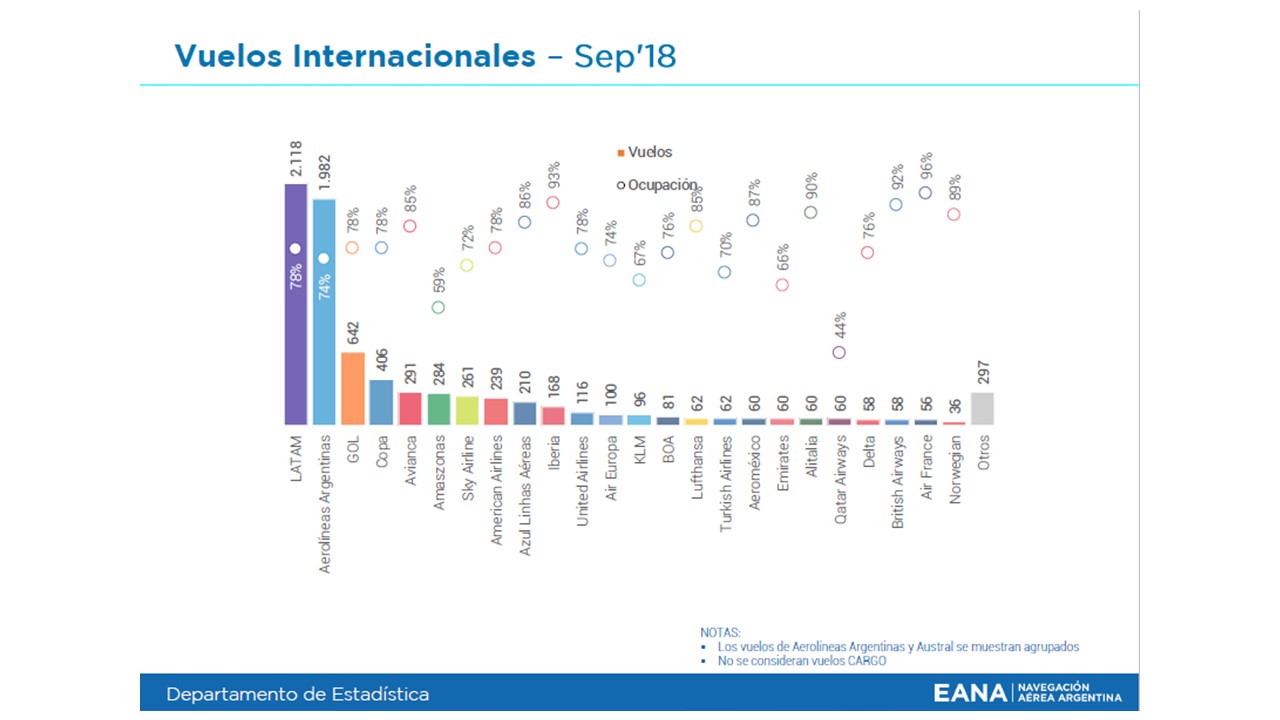 En el plano Internacional el grupo Aerolíneas Argentinas (Aerolíneas Argentinas + Austral) presenta un factor de ocupación del 76% esto significa un 6% menos con respecto al período anterior y su cuota de mercado es del 22% un 3% menos en relación con el año 2017. LATAM presentó un factor de ocupación del 78% esto es un 6% menos con el período anterior y su cuota de mercado es del 26% un 2% menos con relación al período anterior. GOL Líneas Aéreas presentó un factor de ocupación del 78% no presenta variaciones con respecto al período anterior a lo igual que su cuota de mercado. Copa Airlines por su parte alcanzó un 78% de factor de ocupación esto significó un 8% menos en igual período año anterior y su cuota de mercado alcanzó un 4% esto significó un alza del 1% en igual período. Amaszonas alcanzó un 59% de factor de ocupación un 3% menos y su cuota de mercado se mantuvo estable en un 1%. Avianca alcanzó un factor de ocupación del 85% un 2% menos si tomamos igual período año anterior y su cuota de mercado subió un 1% alcanzando el 4%.