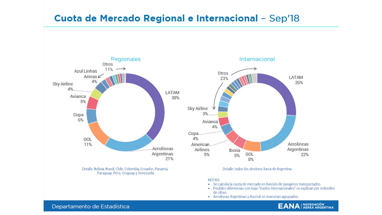 En el caso de los vuelos Regionales (Internacionales) el grupo Aerolíneas Argentinas (Aerolíneas Argentinas + Austral) presentó una caída del 7% en su factor de ocupación al alcanzar un 70% de ocupación y su cuota de mercado tuvo un descenso del 3% alcanzando un 21% de la cuota. LATAM obtuvo una caída del 6% en el factor de ocupación con un factor del 78% y su cuota de mercado descendió un 2% obteniendo así un 37%. GOL Líneas Aéreas sin variaciones en su factor de ocupación se situó en un 78% y su cuota de mercado tampoco se vio afectada llegando al 11%. Copa Airlines por su parte sufre una caída del 8% en su factor de ocupación situándose en un 78% y su cuota de mercado en cambio tuvo un alza del 1% llegando al 6%. Amaszonas presentó un factor de ocupación del 59% esto implica una caída del 3% en relación con el período anterior y su cuota de mercado se mantiene estable en un 1%. Sky Airlines sufre una caída del 5% en su factor de ocupación al alcanzar el 72% y su cuota de mercado se mantiene sin variaciones con un 4%.